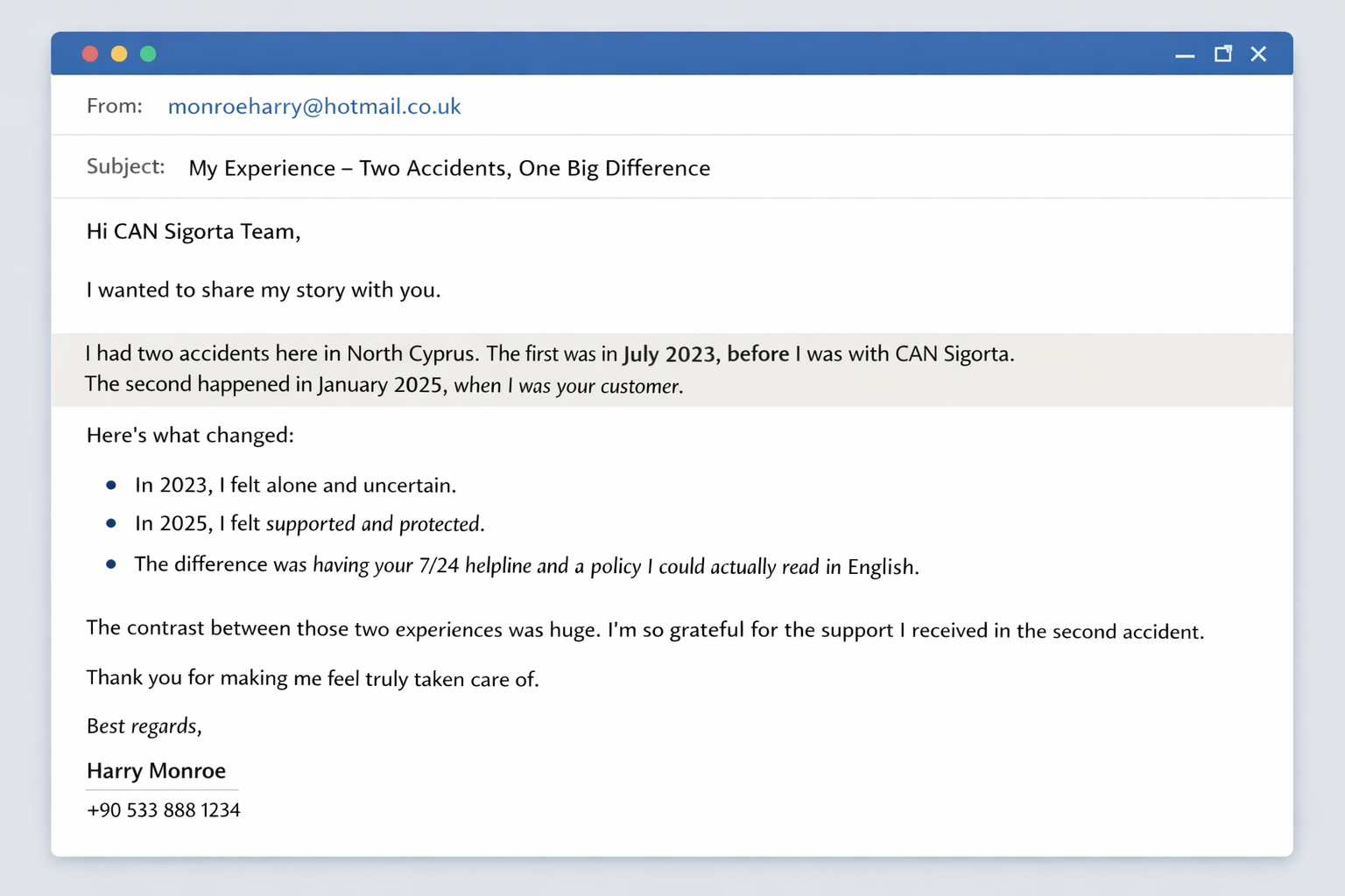 "Can Sigorta (Insurance) always provide excellent service from start to finish. The team is professional, approachable, and clear in their communication. They’ve made the whole process simple and stress-free, and I completely trust them with my car and home insurance."
