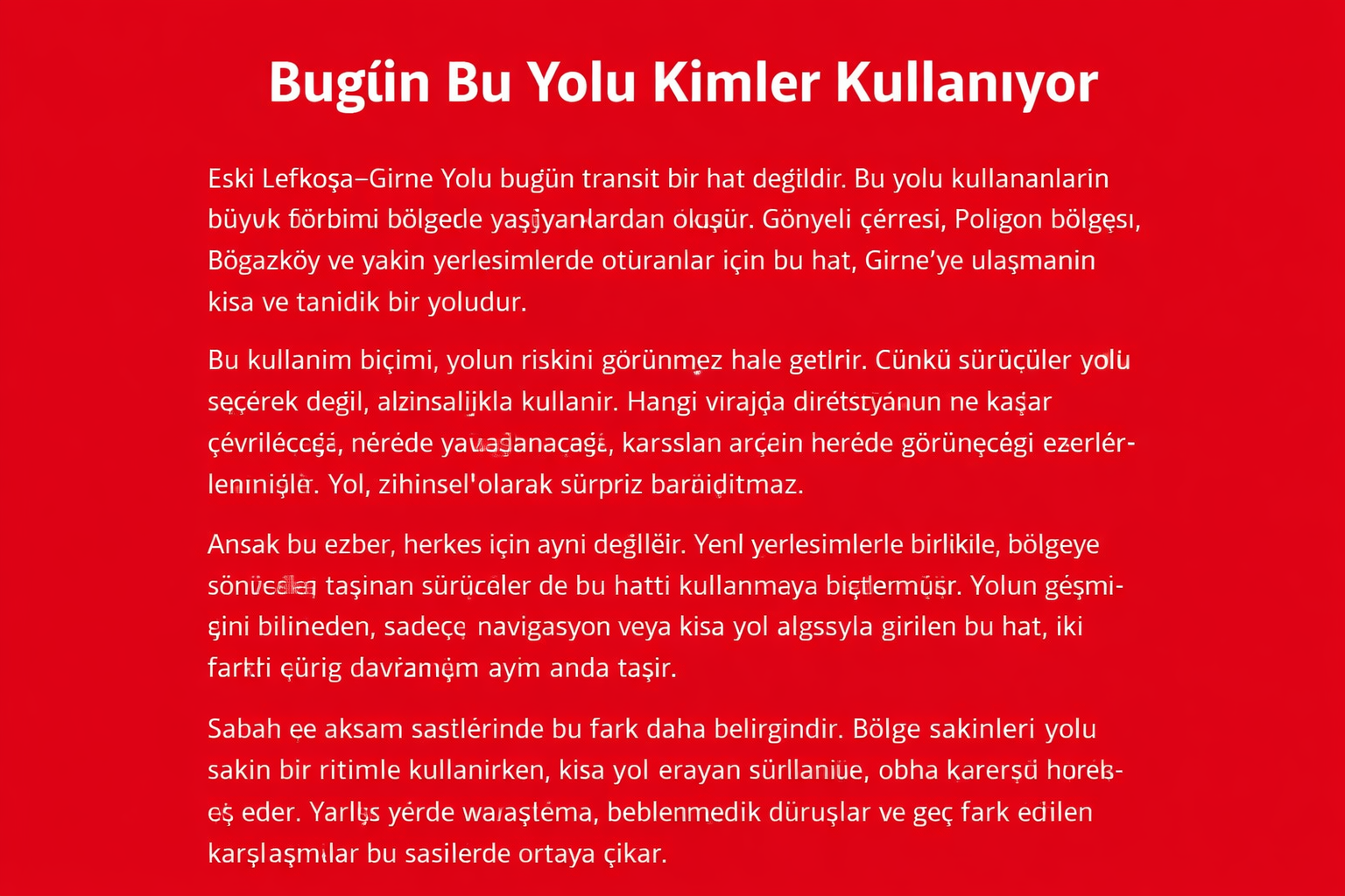 Gayretköy Köprü Geçişinde Akşam Rüzgâr Sapması Yer: Gayretköy – köy girişindeki küçük köprü geçişi ve açık tarla hattı. Gayretköy’e yaklaşırken ana yol kısa bir köprü üzerinden geçer. Köprü sonrası hat tekrar açık araziye bağlanır. Bu geçiş sade görünür. Ancak akşam saatlerinde rüzgâr yönü belirleyici olur. Risk köprüden değil, açık alandaki ani yan rüzgârdan doğar. Neden Burada? Köprü kesiti çevreye göre daha açıktır. Yan korkuluk dışında rüzgârı kesen doğal engel yoktur. Gün batımına doğru açık tarla hattında yan rüzgâr hızlanır. Araç köprüye girerken rüzgârı daha az hisseder, çıkışta ise ani bir itme etkisi oluşur. Bu geçiş birkaç saniyeliktir. Ancak şerit pozisyonu etkilenir. Zaman Katmanı Risk özellikle 18.00–19.00 arasında belirginleşir. • Gün batımı • Köy dönüşü • Tarla hattında rüzgâr artışı Akşam serinliğiyle birlikte rüzgâr yön değiştirir. Açık alanda yan basınç artar. Yerel Davranış Sürücüler köprüyü riskli bir nokta olarak görmez. Yol düz olduğu için hız sabit tutulur. Köprü çıkışında direksiyon düzeltmesi gecikirse araç merkez çizgisine yaklaşabilir. Karşı yönden gelen araç da aynı rüzgâr etkisine maruz kalır. Somut Senaryo Saat 18.25. Köprüden geçen bir araç çıkışta ani yan rüzgâr hisseder. Direksiyon hafif sola kayar. Aynı anda karşı yönden gelen araç da benzer bir düzeltme yapmaktadır. İki araç kısa süreli olarak merkez çizgisine yaklaşır. Temas oluşmayabilir. Ancak risk, rüzgârın köprü çıkışında ani hissedilmesinden kaynaklanır. Gayretköy köprü geçişinde akşam tehlike yol daralmasından değil, açık alan rüzgârının geçiş anında oluşturduğu sapmadan doğar. Yol değişmez, hava akımı değişir.